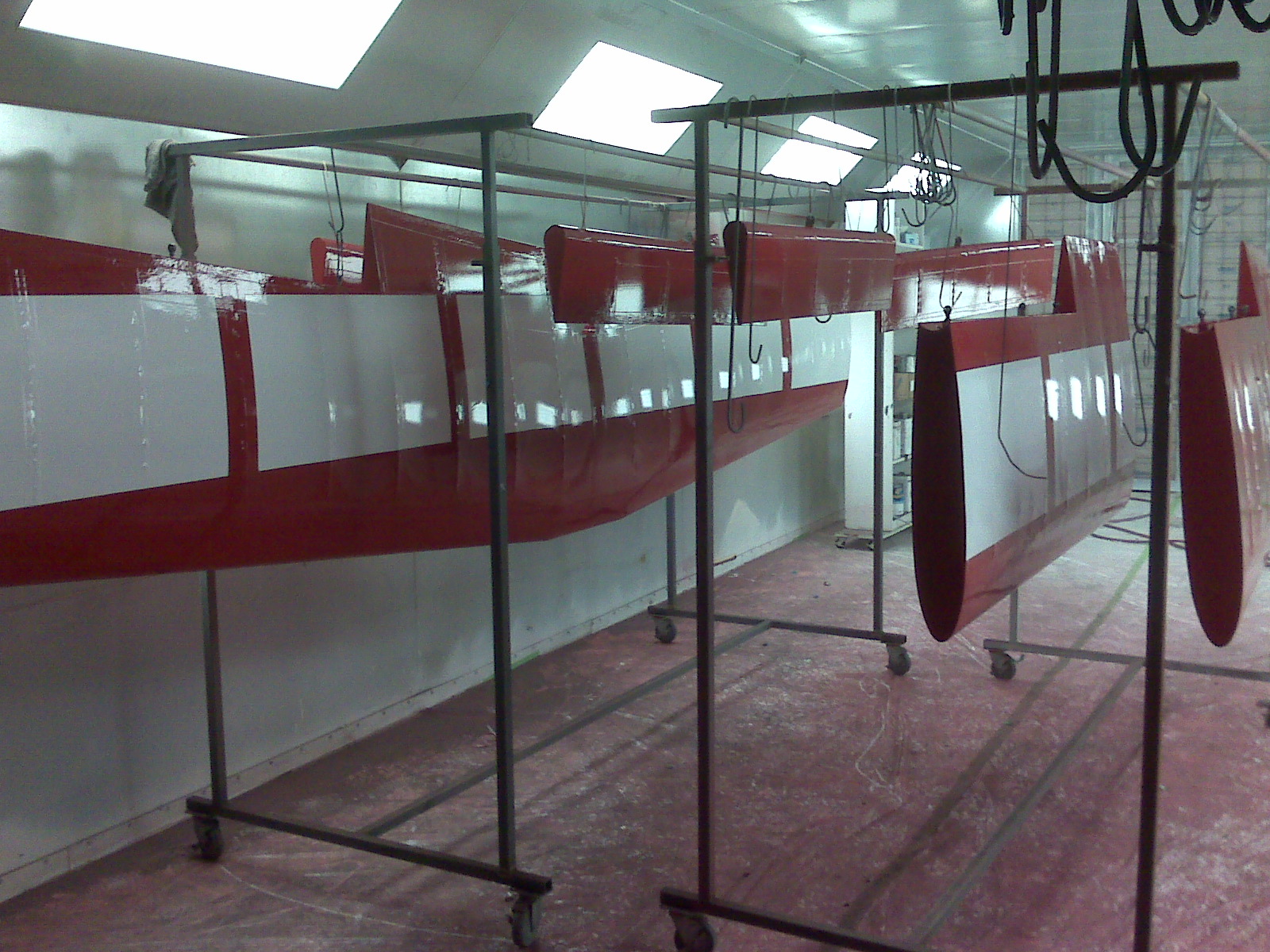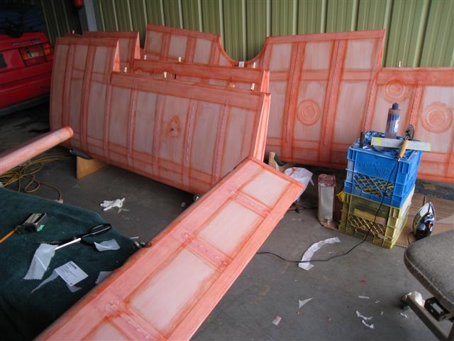 painting. As you can see I am back in the hangar. After a few nights of MEK induced hallucinations, I came home to find my family had thrown both my wings and my suitcases out onto the front lawn. You need a detached garage to get away with fabric work at home. |