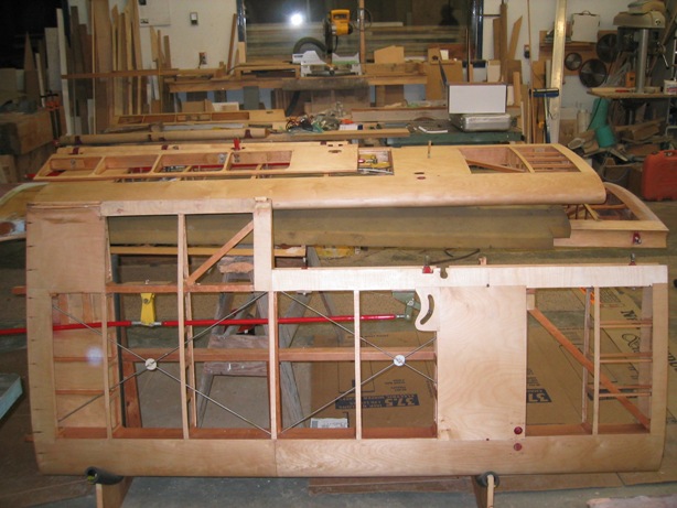 | Top wing getting the fabric Poly-Tac'd on. Bottoms already done. Working in the garage, so I've got to time the Poly-brush application for when the house is deserted. I'm going to test out that old adage of "a family that rib stitches together, stays together". |