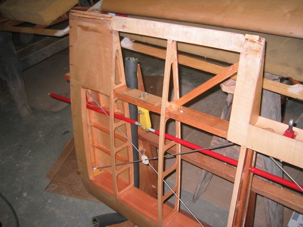 | Duh! Thought I had everything inside tightened before the fabric and turns out I forgot the aileron attach fittings on the lower wings that were a little loose. No need for another inspection cover, carved a 3/8" x 1/2" hole (just big enough for the end of my smallest 3/8" box end wrench) in the plywood end plate and reaching the nuts that way. Tiny fabric patch over the hole. Whew, that was easy. |