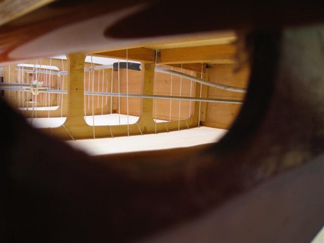 | Plywood drilled 7/64" to let the needle through. Stitched the walkways and inside of the I-strut bay like this. Used screws on washers on the center section and outside of I-strut bays. | ![]() |